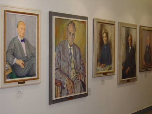 Von vielen Ehren∙bürgern gibt es ein Porträt. Diese Porträts hängen auf den Fluren um den Plenar∙saal herum.