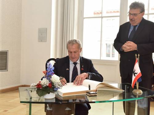 Der neuseeländische Parlamentspräsident trägt sich ins Goldene Buch ein