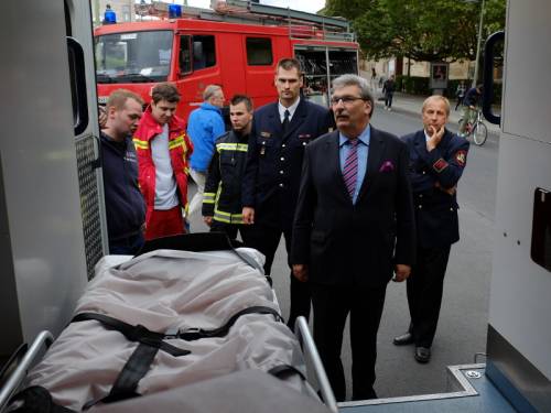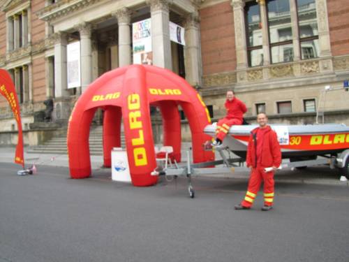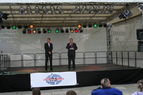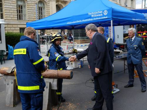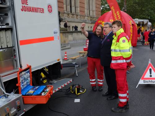 Auf der Bühne vor dem Abgeordnetenhaus ehrte Parlamentspräsident Wieland stellvertretend für tausende ehrenamtlich Tätige jeweils zwei Mitarbeiter der anwesenden Hilfsorganisationen. Sie erhielten für ihr hohes Engagement eine silberne Gedenkmünze des Abgeordnetenhauses. Für den Arbeiter-Samariter-Bund wurde Christian Fechner geehrt, der bereits 32 Jahre Mitglied ist und heute im Sanitätsdienst und in der Ausbildung tätig ist. Außerdem erhielt die Ehrung die Mitbegründerin des Rettungshundefachdienstes Frau Naggatz. Sie war während des Hochwassers 2013 im Einsatz und ist ansonsten international aktiv.