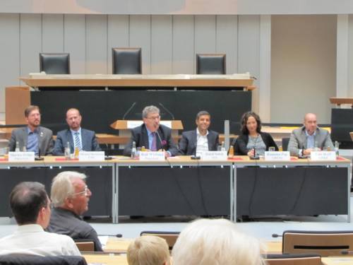 Start der sogenannten "Elefanten-Runde". Die Fraktionsvorsitzenden der im Abgeordnetenhaus vertretenen Parteien stellten sich den Fragen der Besucherinnen und Besucher. Ein Thema interessierte besonders: Wie geht Berlin mit den vielen Flüchtlingen um? Dabei zeigte sich, dass alle Fraktionen sicher sind, das Problem zu lösen, auch wenn es derzeit in der Organisation der Hilfe noch öfter hapert. Interesse fand die Frage nach der Nachhaltigkeit der wirtschaftlichen Entwicklung Berlins. Zudem wollten einige Fragesteller wissen, wie es um die Energiewende in der Stadt steht.
