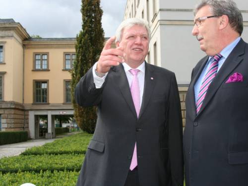 Zusammentreffen der beiden Präsidenten, deren Häuser Nachbarn sind, an der Grundstücksgrenze: Der hessische Ministerpräsident Volker Bouffier als Bundesratspräsident und der Präsident des Berliner Abgeordnetenhauses Ralf Wieland. Im Anschluss gingen beide ins Plenum des Bundesrates, um dort moderiert über den Einfluss der Länder auf die Bundespolitik zu sprechen.