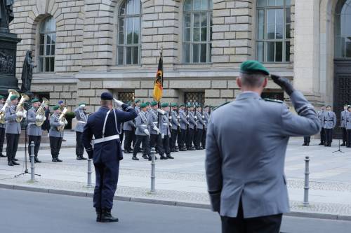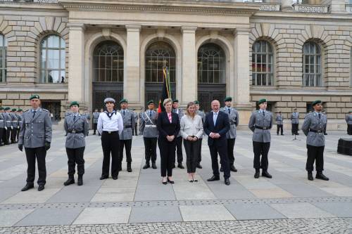 Anlässlich des 75. Jubiläums des Grundgesetzes fand heute das erste öffentliche Gelöbnis vor dem Abgeordnetenhaus von Berlin statt. Rund 30 Rekrutinnen und Rekruten des Wachbataillons beim Bundesministerium der Verteidigung (WachBtl BMVg) legten ihren Diensteid und das Treuebekenntnis zur Rechts- und Werteordnung der Bundesrepublik Deutschland ab und wurden damit Teil der Parlamentsarmee. Zu den circa 140 Gästen gehörten Vertreterinnen und Vertreter aus Politik, Glaubensgemeinschaften und Gesellschaft sowie Angehörige der Rekruten.