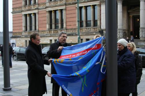 Am Donnerstag, dem 26. November 2015, haben der Präsident des Abgeordnetenhauses von Berlin Ralf Wieland und der Regierende Bürgermeister Michael Müller zusammen mit der Bundesgeschäftsführerin von TERRE DES FEMMES Christa Stolle um 10.30 Uhr auf dem Vorplatz des Abgeordnetenhauses anlässlich des internationalen Gedenktages “NEIN zu Gewalt an Frauen” die Fahne “Frei leben – ohne Gewalt” gehisst.