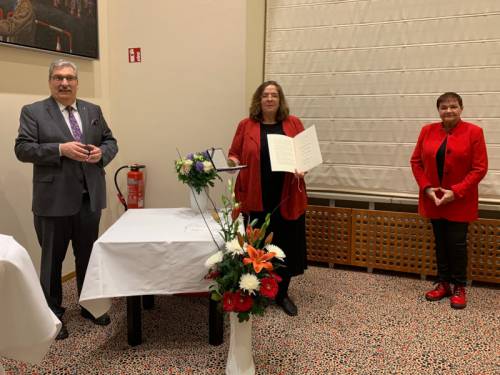 Parlamentspräsident Ralf Wieland übergab die Medaille im kleinen Kreis an Gesa Ederberg. Neben ihm war die stellvertretende Vorsitzende des Kuratoriums Louise-Schroeder-Medaille Abgeordnete Ines Schmidt anwesend.