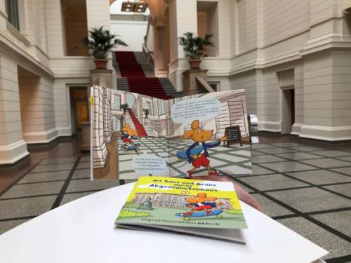In der neuen Kinder-Broschüre „Mit Saus und Braus durchs Abgeordnetenhaus“ stellt die „Abgeordnetenhausmaus“ Andi ihr Zuhause vor. Zusammen mit der Biene Sabine, die auf dem Dach des Hauses lebt, erkundet Andi den Parlamentsbetrieb und findet, dass die Politik in Berlin „voll easy zu verstehen“ ist ...