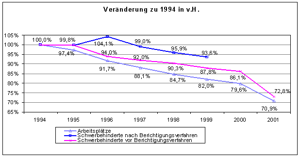 Die Zahl der bei den Arbeitsämtern registrierten arbeitslosen schwerbehinderten Menschen betrug 9.575, der Anteil der schwerbehinderten Menschen an der Gesamtzahl der Arbeitslosen in Berlin betrug 3,5 Prozent.