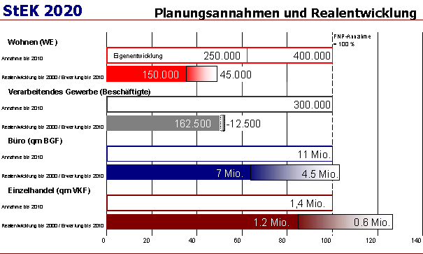 Abb. 1: Vergleich zwischen Planungsannahmen von Anfang der 1990er Jahre mit der Realentwicklung bis 2000 und den heutigen Entwicklungsannahmen bis 2010