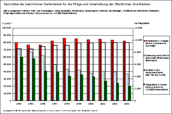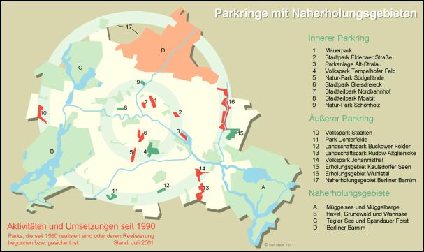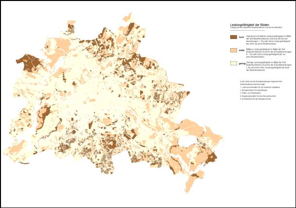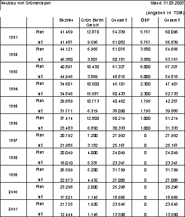 [41] Datenbasis ist nicht – wie bundesweit üblich – die Bilanzierung der Siedlungs- und Verkehrsflächen, die durch das Statistische Landesamt auf der Basis der Angaben des Liegenschaftskatasters erfasst werden, da diese Daten für Berlin keine verlässlichen Angaben zum Flächenverbrauch zulassen. Die genannten Daten beruhen auf Erhebungen zur Karte Freiflächenentwicklung (06.03) des Umweltatlas´, in der die Flächeninanspruchnahme in 10-Jahresschritten kartiert wurde. Die Inanspruchnahme folgender Nutzungskategorien fließen ein: Wald, Grünland, Acker, Park/Grünfläche, Stadtplatz/ Promenade, Friedhof, Kleingarten, Brachfläche, Campingplatz, Sportanlage/Freibad und Baumschule/ Gartenbau. (Quelle Umweltatlas Karte 06.03 Freiflächenentwicklung Tabelle 1)