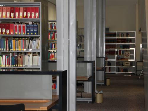 Den Eingang zur Bibliothek (Zi. 120) finden Sie im ersten Stock auf der Westseite gegenüber dem Eingang zur Wandelhalle. Gleich im Vorraum liegen aktuelle regionale und überregionale Tageszeitungen aus; für weitergehende Recherchen steht Ihnen eine Zeitungsdatenbank zur Verfügung. Die Arbeitsplätze im Lesesaal sind laptopgeeignet; WLAN ist vorhanden, so dass auch der Zugang zu weiteren Datenbanken möglich ist.
