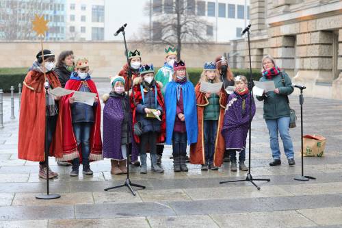 Parlamentspräsident Dennis Buchner empfing am Mittwoch, dem 12. Januar 2022 eine Gruppe Sternsinger aus der katholischen Kirchengemeinde St. Georg in Pankow auf dem Vorplatz des Abgeordnetenhauses. Die Kinder stellten ihr diesjähriges Motto „Gesund werden – gesund bleiben. Ein Kinderrecht weltweit!“ vor. Im Fokus steht dabei die Gesundheitsvorsorge von Kindern in Afrika. Die Sternsingersinnen und Sternsinger sammelten Spenden, sangen Lieder und malten den Segensspruch 20*C+M+B+22 an das Eingangsportal des Berliner Landesparlaments.