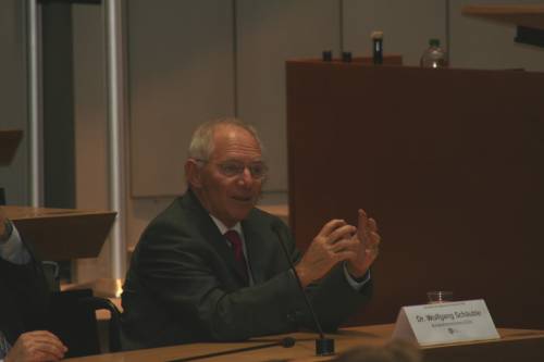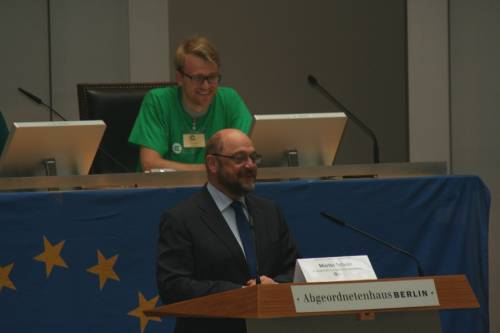 EU-Parlamentspräsident Schulz, Bundesfinanzminister Schäuble und Parlamentspräsident Wieland begrüßen die ‚EU Abgeordneten von morgen‘