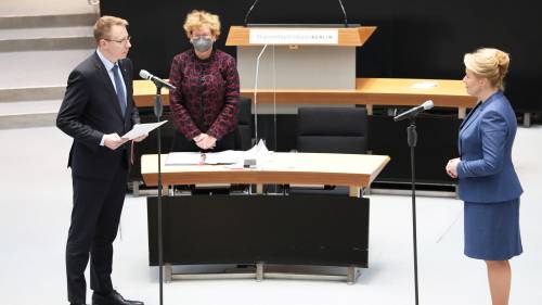 Nach der Ernennung durch die Regierende Bürgermeisterin Franziska Giffey vereidigte der Präsident des Berliner Abgeordnetenhauses Dennis Buchner auch die neuen Senatorinnen und Senatoren. Damit kann die Berliner Landesregierung ihre Arbeit aufnehmen.