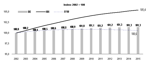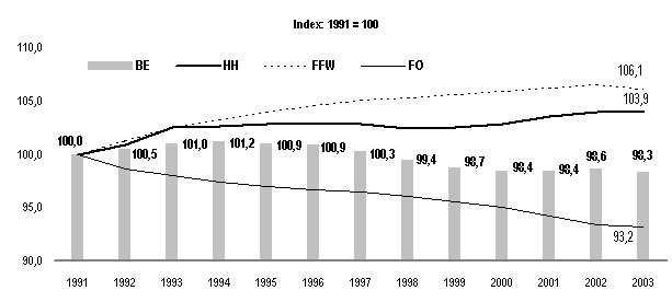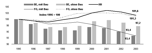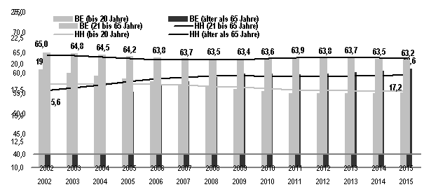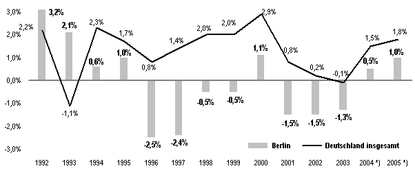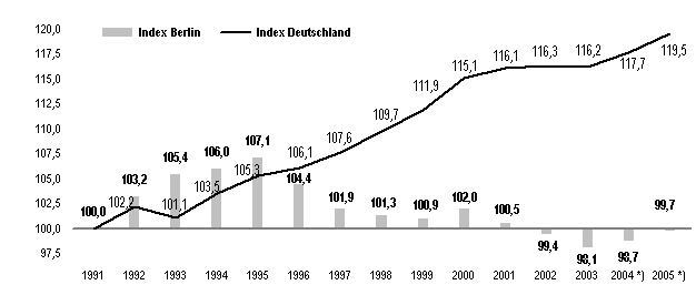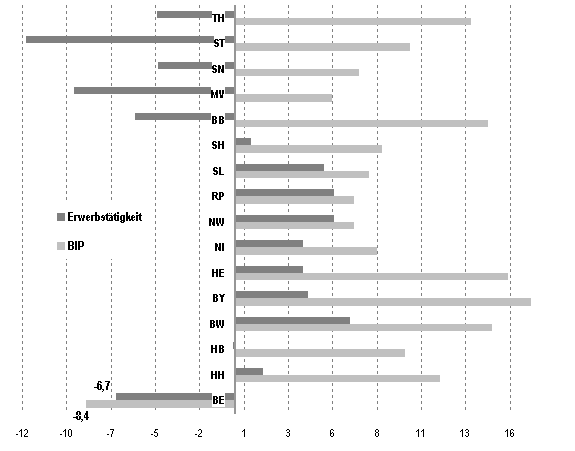 [2] Allerdings ist zu berücksichtigen, dass mit Ausnahme des Landes Brandenburg alle ostdeutschen Länder einen deutlichen Bevölkerungsrückgang (von durchschnittlich nahezu 4 %) zu verzeichnen hatten, während in Berlin der Bevölkerungsrückgang vergleichsweise moderat war. Dies führte dazu, dass Berlin unter allen Ländern den größten Rückgang beim Arbeitsplatzbesatz – Erwerbstätige je 100 Einwohner – zu verzeichnen hatte.