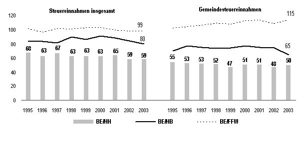 [4] Die Kassenstatistik weicht in diesem Punkt erheblich von dem Haushaltsabschluss ab; diese weist für 2003 556 € je Einwohner aus. Auf die Probleme der Verwendung der Kassenstatistik wurde bereits eingangs unter I.2 (Methodische Vorgehensweise) hingewiesen.