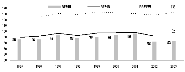 knapp 60 % der Leistungen des Jahres 1996 belaufen.