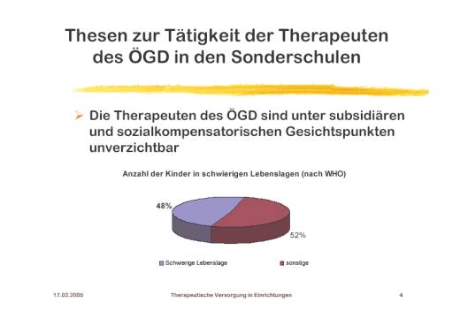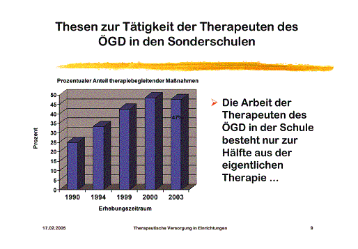 Weitere Vorteile für den Einsatz des ÖGD-Therapeuten sind die schnelle Intervention und das flexible Handeln. Das heißt, wenn die Lehrer schnelle Hilfe brauchen, dann sind die Therapeuten vor Ort, ansprechbar und können schnell reagieren, wie zum Beispiel Schienen anpassen oder tonusregulierende Maßnahmen durchführen, beispielsweise vor dem Essen. Wir haben auch festgestellt, dass die Kinder relativ häufig krank sind. Bedingt durch den Schweregrad ihrer Behinderung hatten wir allen im vergangenen Jahr 22 % Ausfälle. Dabei darf nicht vergessen werden, dass keiner Praxis diese Ausfälle bezahlt werden. Wenn die Kinder nicht erscheinen, weil sie erkrankt sind oder auch aus sozialkompensatorischen Gründen nicht zum Unterricht kommen, dann werden diese Kosten nicht getragen.