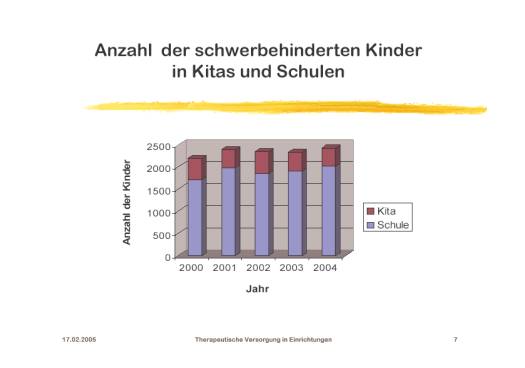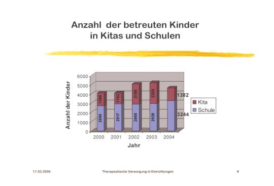 Hier noch einige Zahlen zur Gesamtversorgung der Therapeuten: Beispielsweise wurden im Jahr 2004 in den Kitas und Schulen insgesamt 4 626 Kinder durch Therapeuten der Bezirksämter betreut. – Der Einbruch der letzten Säule deutet bereits auf die Einwirkung des Stellenabbaus.