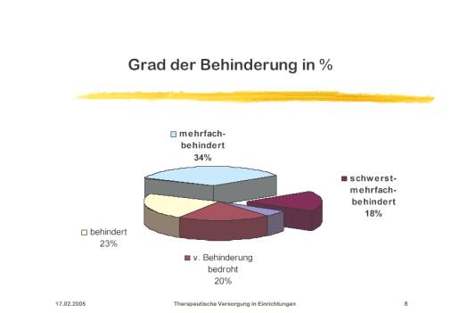 Vom Grad der Behinderung her bedeutet das, dass von allen Kindern, die wir betreuen, allein 52 % schwerstmehrfach behinderte Kinder sind. Hinzu kommt, dass nicht nur die Anzahl der Kinder mit schweren Behinderungen gleich geblieben ist, sondern dass auch die Schwere der Behinderungen zugenommen hat. Wir hatten früher in unserer Schule nur ein Rollstuhlkind, und jetzt haben wir 30 Rollstuhlkinder. Die Schwere der Behinderungen nimmt weiter zu. Das gibt uns einen Hinweis auf die Arbeitsintensität, die die Therapeuten aufbringen müssen. Bei den schwermehrfach behinderten Kindern ist der therapeutische Zeitaufwand zu verdoppeln, denn mit zunehmendem Alter und durch das Wachstum der Kinder wird ein zweiter Therapeut pro Therapiestunde notwendig.