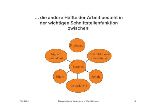 Anhand der Kurve lässt sich die Komplexität der Probleme der behinderten Kinder gut erkennen. Sie macht eine intensiv begleitende und beratende therapeutische Arbeit notwendig. Diese Kurve zeigt, dass der zeitliche Aufwand nicht ausschließlich der Therapie gewidmet ist, sondern 47 % sind therapiebegleitende Maßnahmen. Das heißt, die Arbeit besteht ca. zur Hälfte aus therapiebegleitenden Maßnahmen, die unter anderem auch wichtige Schnittstellenfunktionen haben, bei denen der Therapeut mit dem Kinderarzt, den Ärzten und Mitarbeitern der Kinder- und Jugendgesundheitsdienste, den Eltern, den Sozial- und Jugendämtern, Rehabilitationseinrichtungen und der Schule zusammenarbeitet.