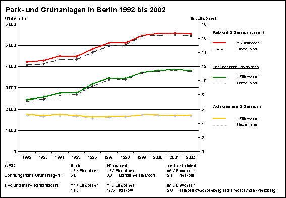 [41] Datenbasis ist nicht – wie bundesweit üblich – die Bilanzierung der Siedlungs- und Verkehrsflächen, die durch das Statistische Landesamt auf der Basis der Angaben des Liegenschaftskatasters erfasst werden, da diese Daten für Berlin keine verlässlichen Angaben zum Flächenverbrauch zulassen. Die genannten Daten beruhen auf Erhebungen zur Karte Freiflächenentwicklung (06.03) des Umweltatlas´, in der die Flächeninanspruchnahme in 10-Jahresschritten kartiert wurde. Die Inanspruchnahme folgender Nutzungskategorien fließen ein: Wald, Grünland, Acker, Park/Grünfläche, Stadtplatz/ Promenade, Friedhof, Kleingarten, Brachfläche, Campingplatz, Sportanlage/Freibad und Baumschule/ Gartenbau. (Quelle Umweltatlas Karte 06.03 Freiflächenentwicklung Tabelle 1)