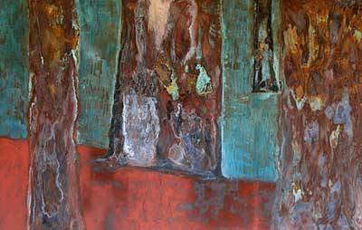 Bernd Aury hat sich beim Wandern im Hochschwarzwald mit dem "Mythos Wald" und dem Philosophen Martin Heidegger auseinandergesetzt. Im Berliner Atelier brachte er seine Eindrücke in chemischen Experimenten mit metallischen Pigmenten und Säuren auf die Leinwand. Der Zyklus "Hüttenweg" - Schwarzwald 2004 handelt von persönlicher Naturerfahrung und von der Faszination des Waldes als Rückzugsort.